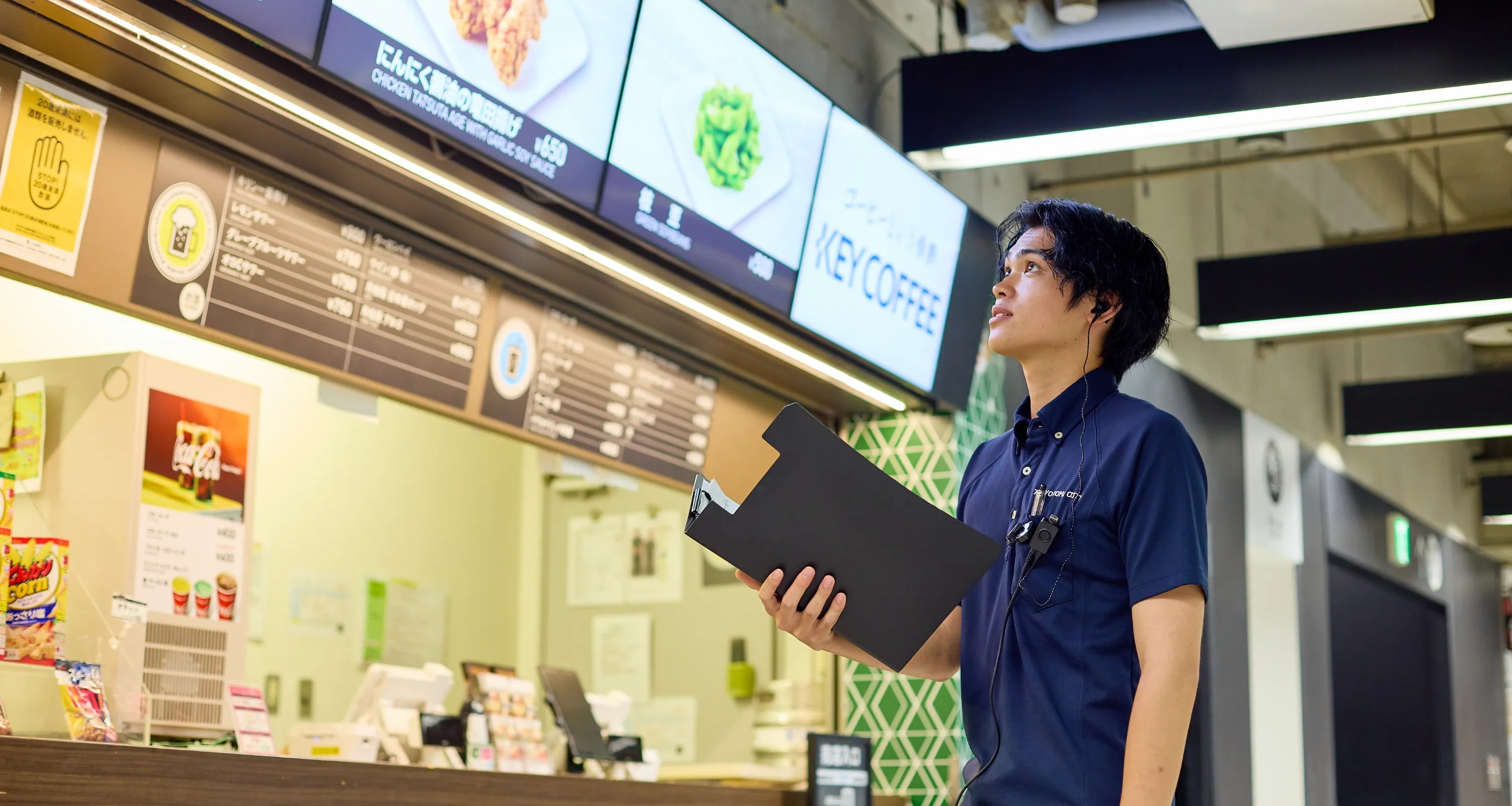 今までで最もワクワクした挑戦は、年に数回開催される「生ビール半額デー」の販促企画です。前回の売上が伸び悩んでいたことを受け、より多くのお客様に本企画を楽しんでいただくべく、チームメンバーとアイデアを議論しました。議論の中で、前回は売店の上部に掲示しているモニターの一部のみでしか半額デーの告知を掲示できていなかったことに気が付き、「そもそもビールが半額になっていることが認知されていないのでは」(=企画の認知度に原因がある)と仮説を立てました。そして、モニター全面を半額デーの告知でジャックし、お客様の動線となるパーテーションにもポップを複数掲示し、一目で見て「ビールがお得な日」と認識できるようにすると決め、即座に実行しました。迎えた「生ビール半額デー」の当日、モニターやポップを見たお客様が次々と来店された結果、前回の2倍近い売上を達成できました。