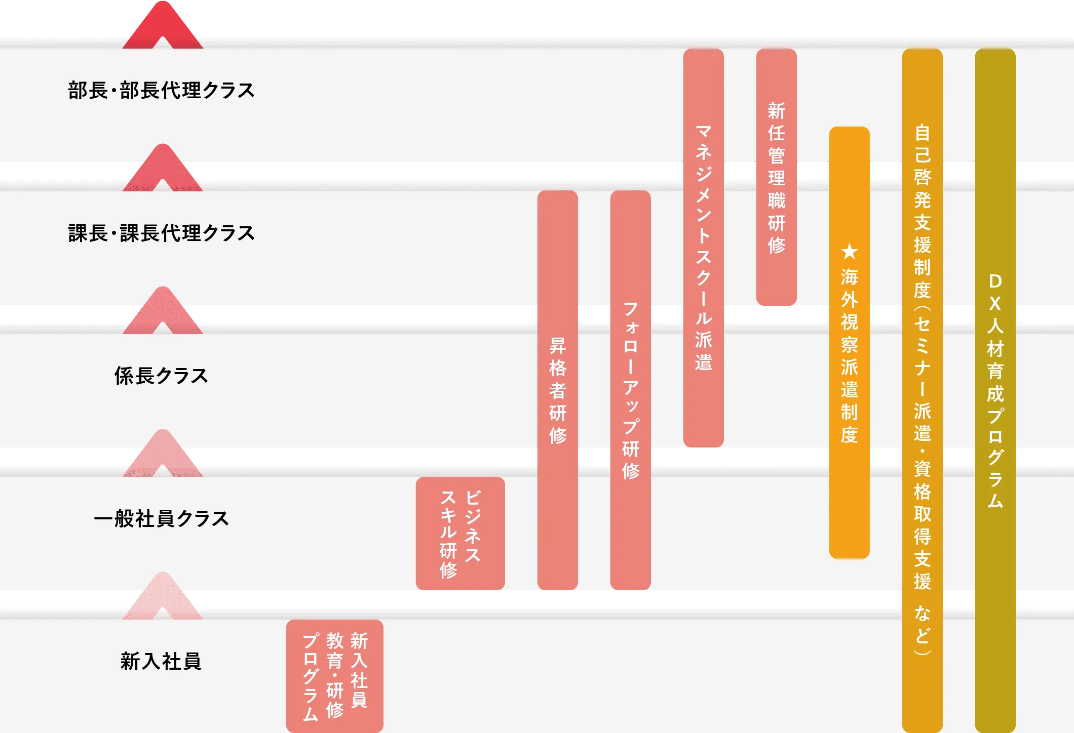 東京ドームグループでは、社員一人ひとりのキャリア形成とスキル向上を支援するため、階層別・目的別に多彩な研修プログラムを用意しています。