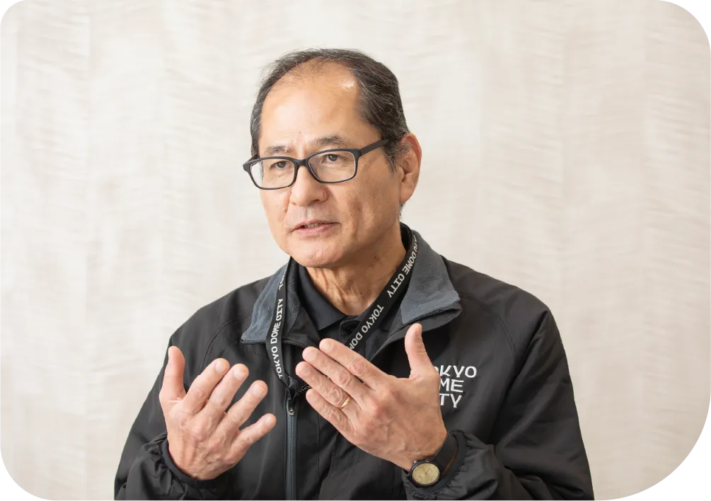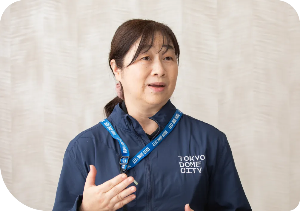 東京ドーム本社を中心に約37年間勤務し、複数部署を経験。人事・経理などの業務を経て、障がい者雇用の現場に強い関心を持ち、東京ドームウィズへの出向を希望。現在は庶務チームのマネージャーとして、 メンバー一人ひとりの特性や状況を丁寧に見つめながら、配置や声かけを行っている。感情的に叱るのではなく「指導として伝える」ことを重視し、対人の仕事を通じて自身も学び続けている。