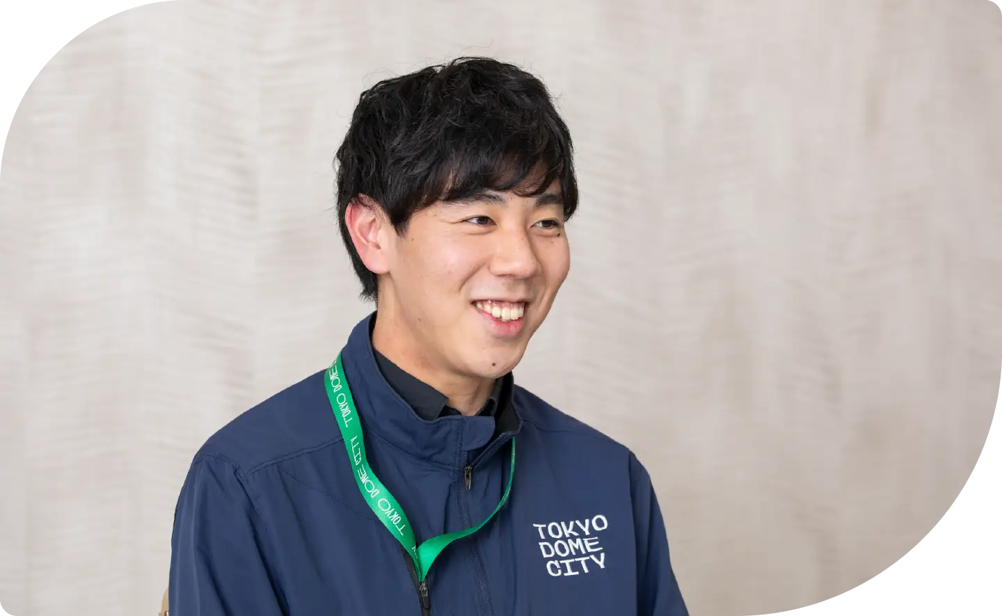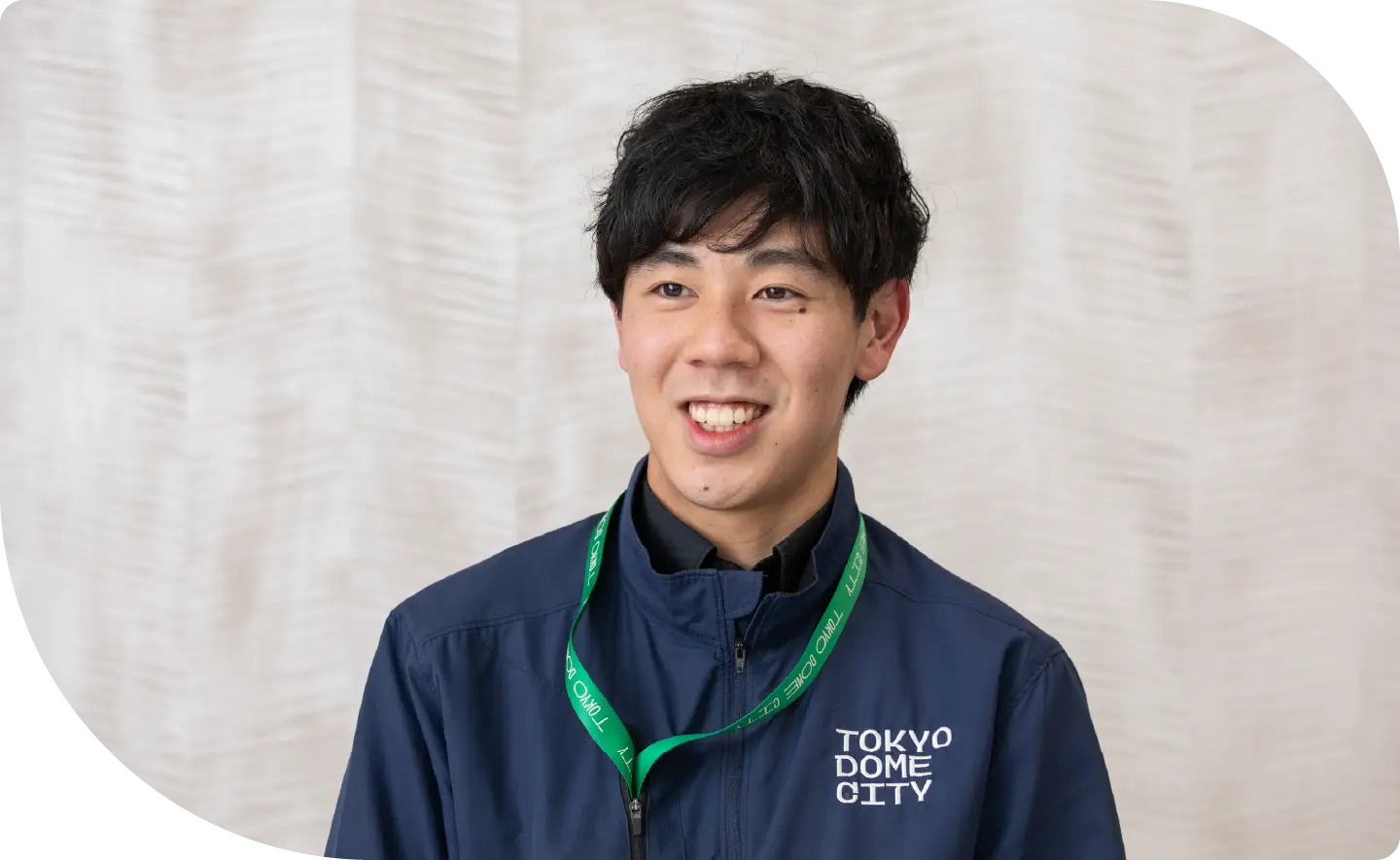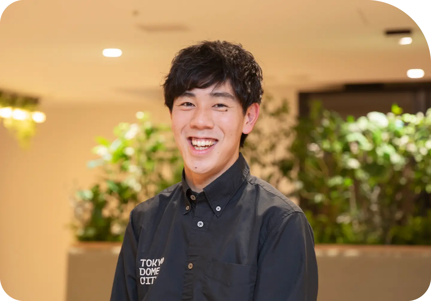 東京ドームウィズ カフェチーム所属。東京ドーム本社内カフェで、コーヒーやドリンクの提供、清掃、マシン管理などを担当。2021年入社。 人と接することに少し苦手意識を持ちながらも、状況を見て動く力を身につけ、仕事の幅を広げてきた。今は「行動で伝える接客」を大切にしている。