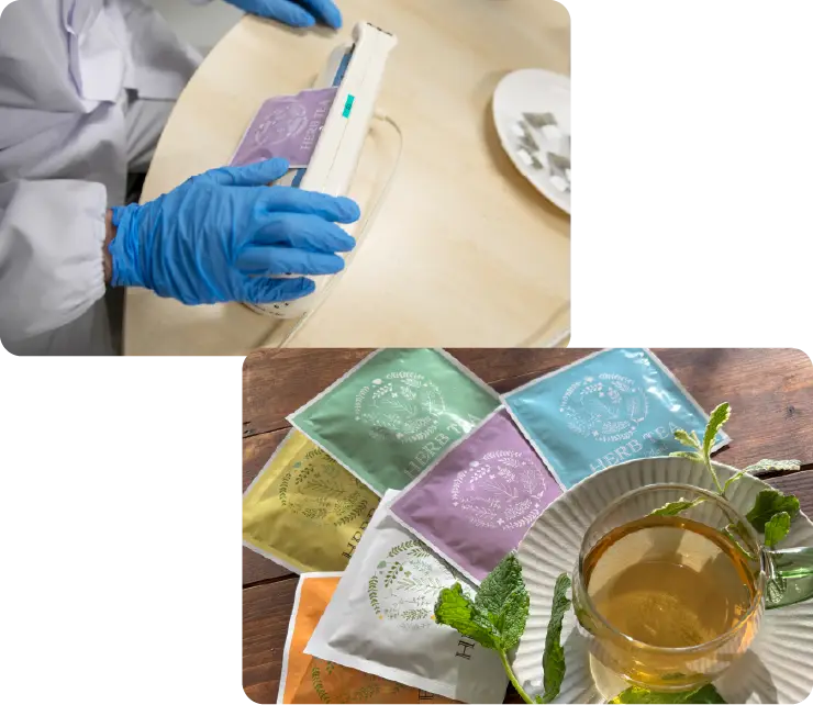 2)ハーブティーへの加工業務:葉の乾燥、ブレンド、計量、ティーバッグへの袋詰め、包装(製品化)