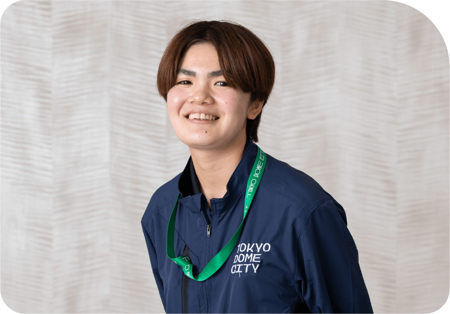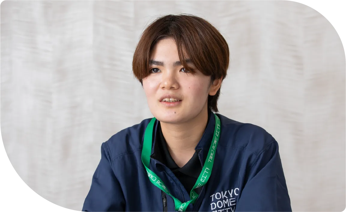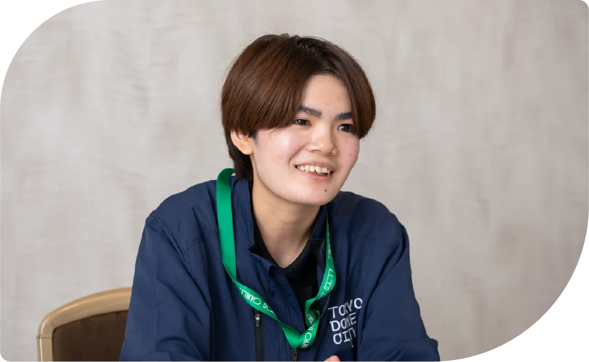 東京ドームウィズ 庶務チーム所属。2025年4月入社。館内のユニフォーム回収・運搬、パンフレット補充、清掃、社内郵便配達、シール貼りなど多岐にわたる業務を担当。体を動かす作業が好きで、1日1万歩歩く日も。 入社後は挨拶や発信が増え、自分らしく明るく働けるように。先日、母校の特別支援学校で後輩に向けて、就職に必要な心構えも伝えた。