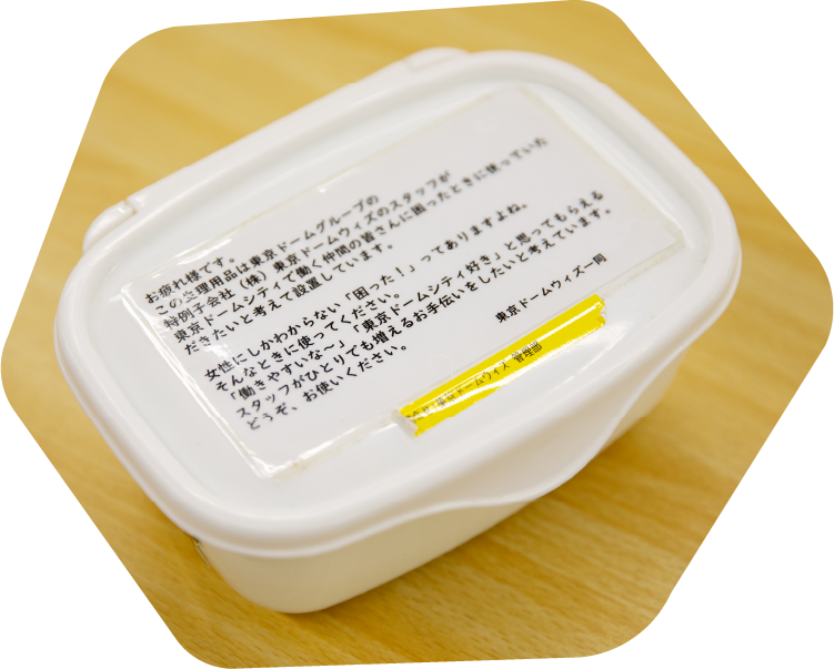 多くの女性社員やアルバイトのみなさんたちが日々働いています。そんな中で、急に困ることがないよう、女子トイレに無料で使えるナプキンを設置しました。 これは、東京ドームウィズの現場から生まれた取り組みの一つです。特別な制度ではなく、「誰かが困らないためにできること」を形にした、ささやかな思いやりのサービスです。